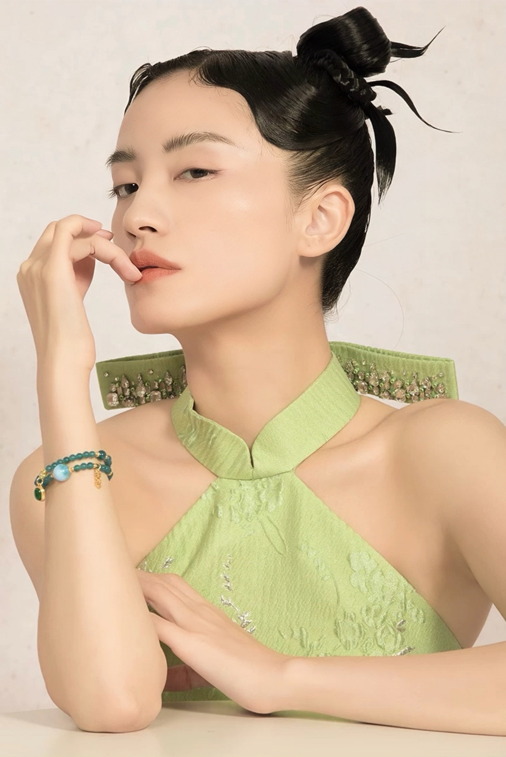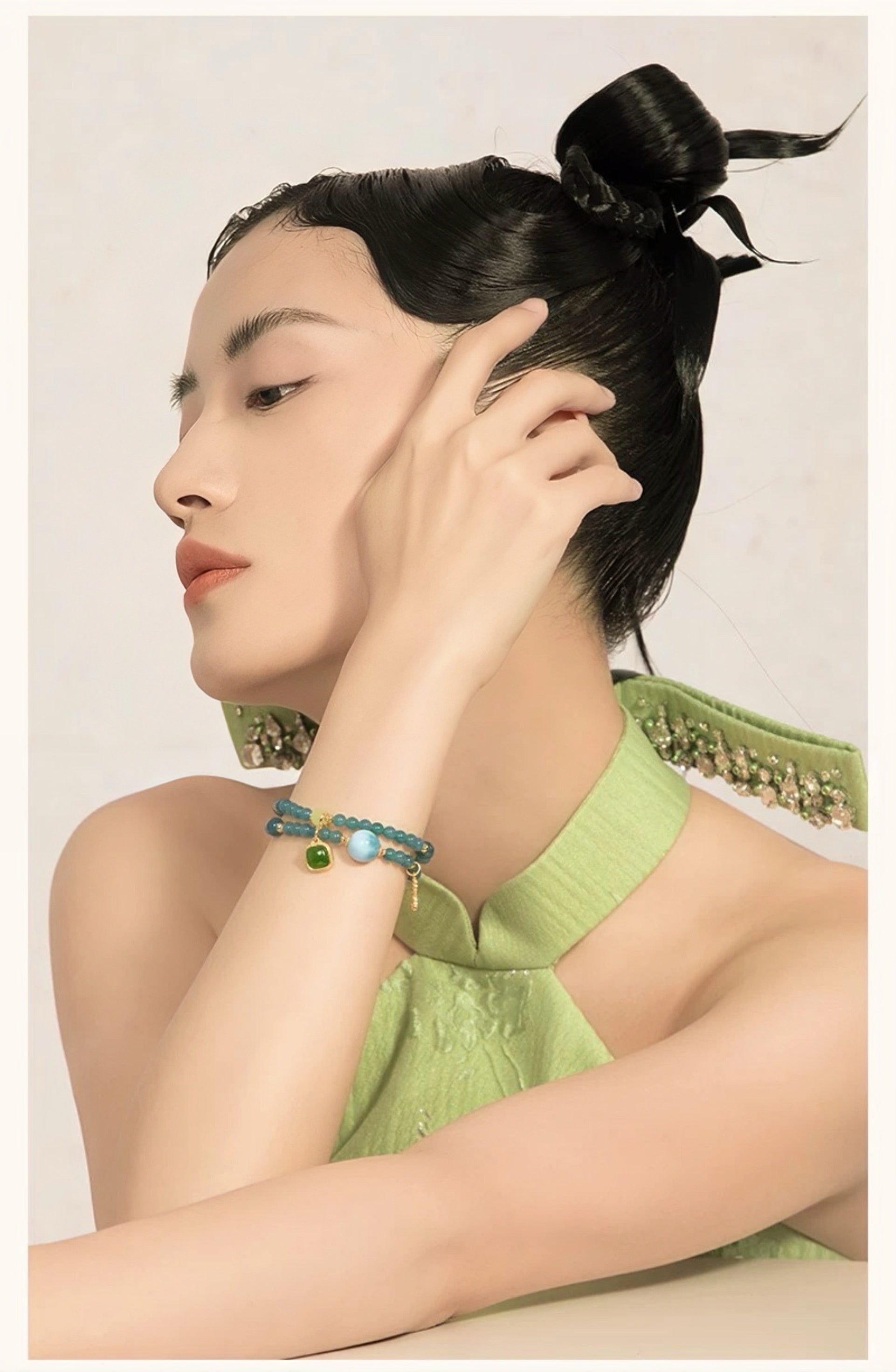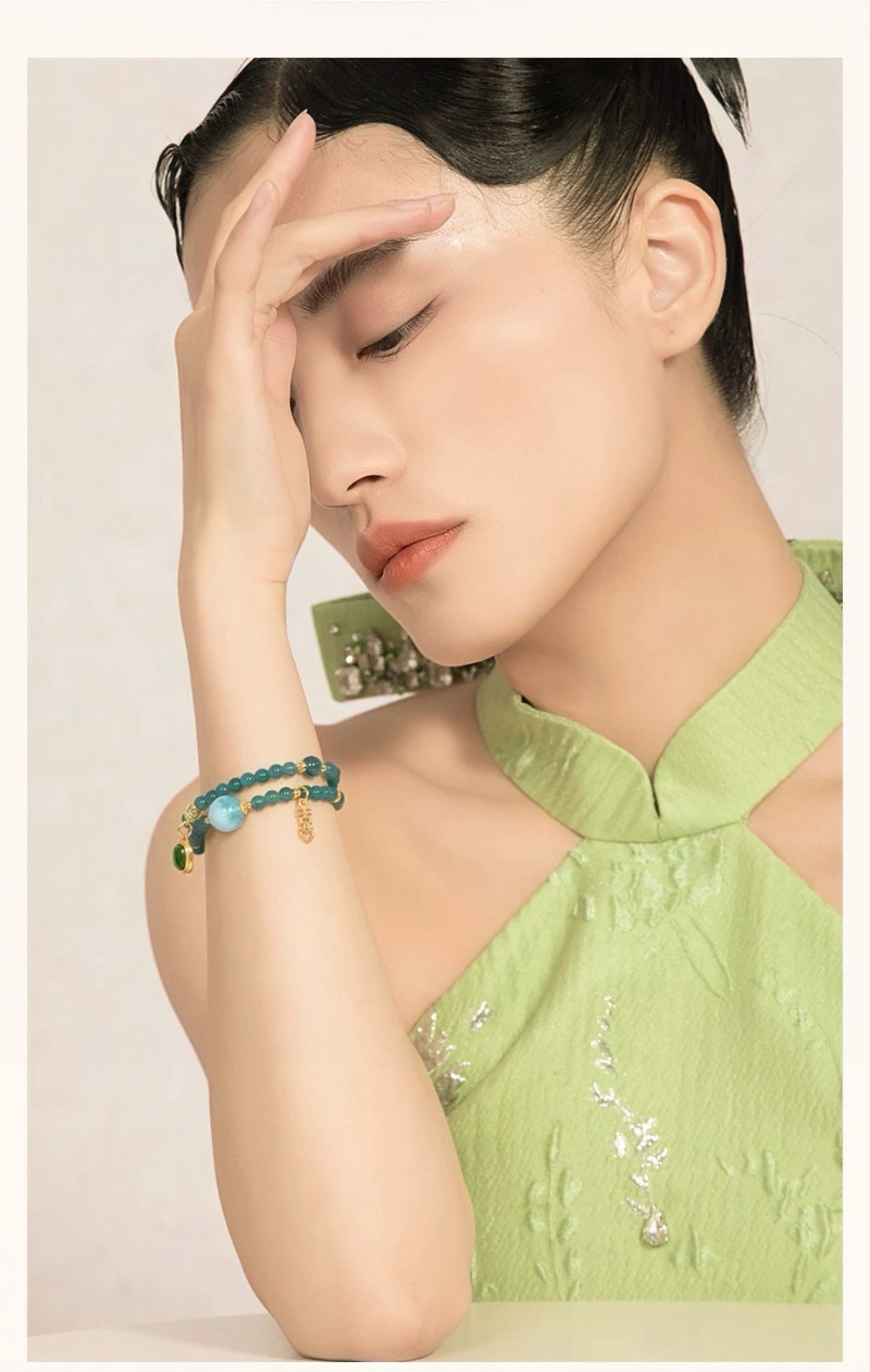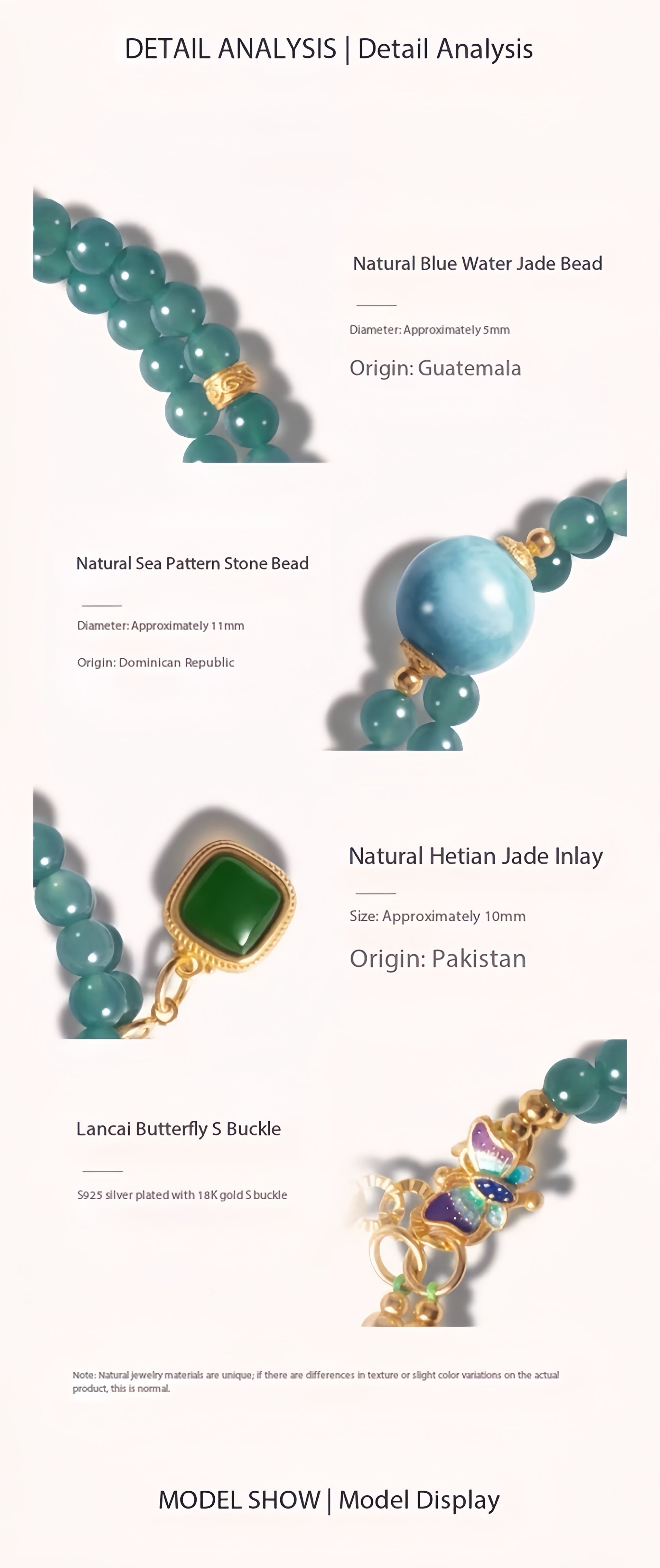 This bracelet is a talisman crafted to attract soul-deep connection, blending rare stones with timeless grace. More than jewelry, it is a curated energy field for love. Each piece holds meaning: serene blue jadeite symbolizes emotional clarity, Caribbean Larimar soothes and opens the heart, the butterfly clasp represents love's transformation, and freshwater pearls embody wisdom and inner light.