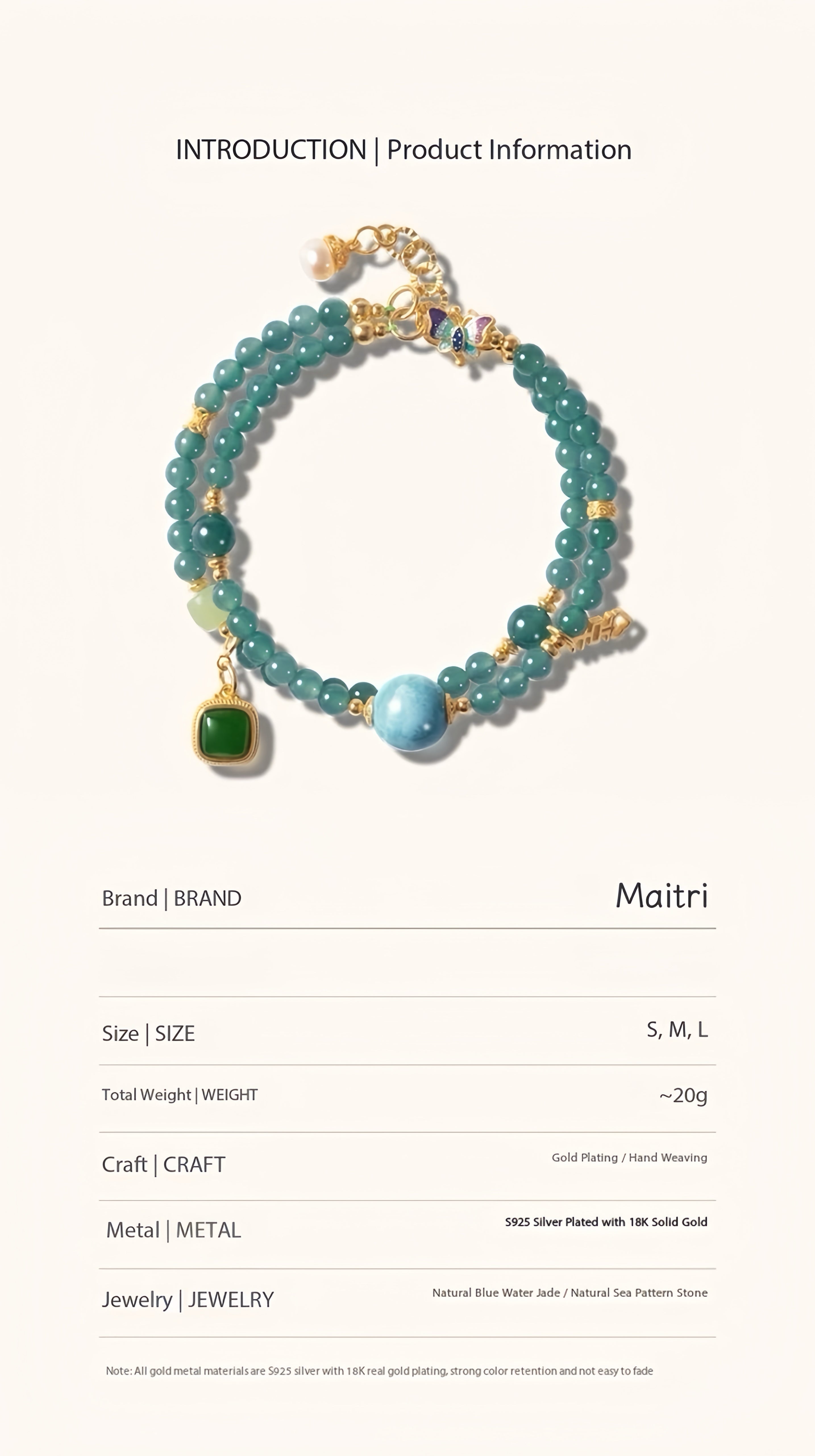 Returning home, a golden butterfly touched his coat button and became a clasp. He combined these elements into a bracelet. Wearing it, he grew calm and whole. When he had learned to love himself, he naturally met a woman whose soul resonated with his at an art exhibition. Their connection was instant and deep. This story inspires the bracelet's design: true love begins within, and wholeness attracts resonance.