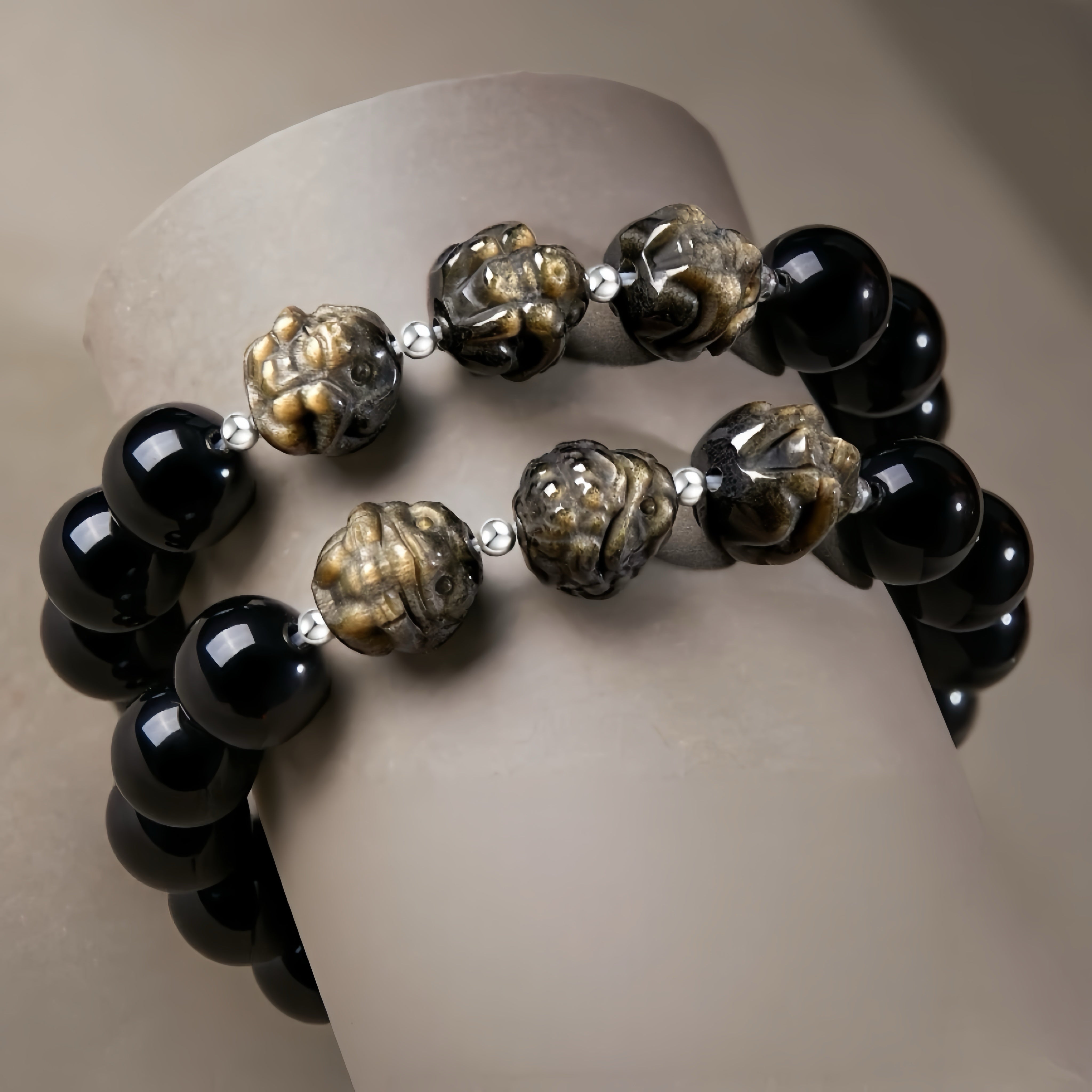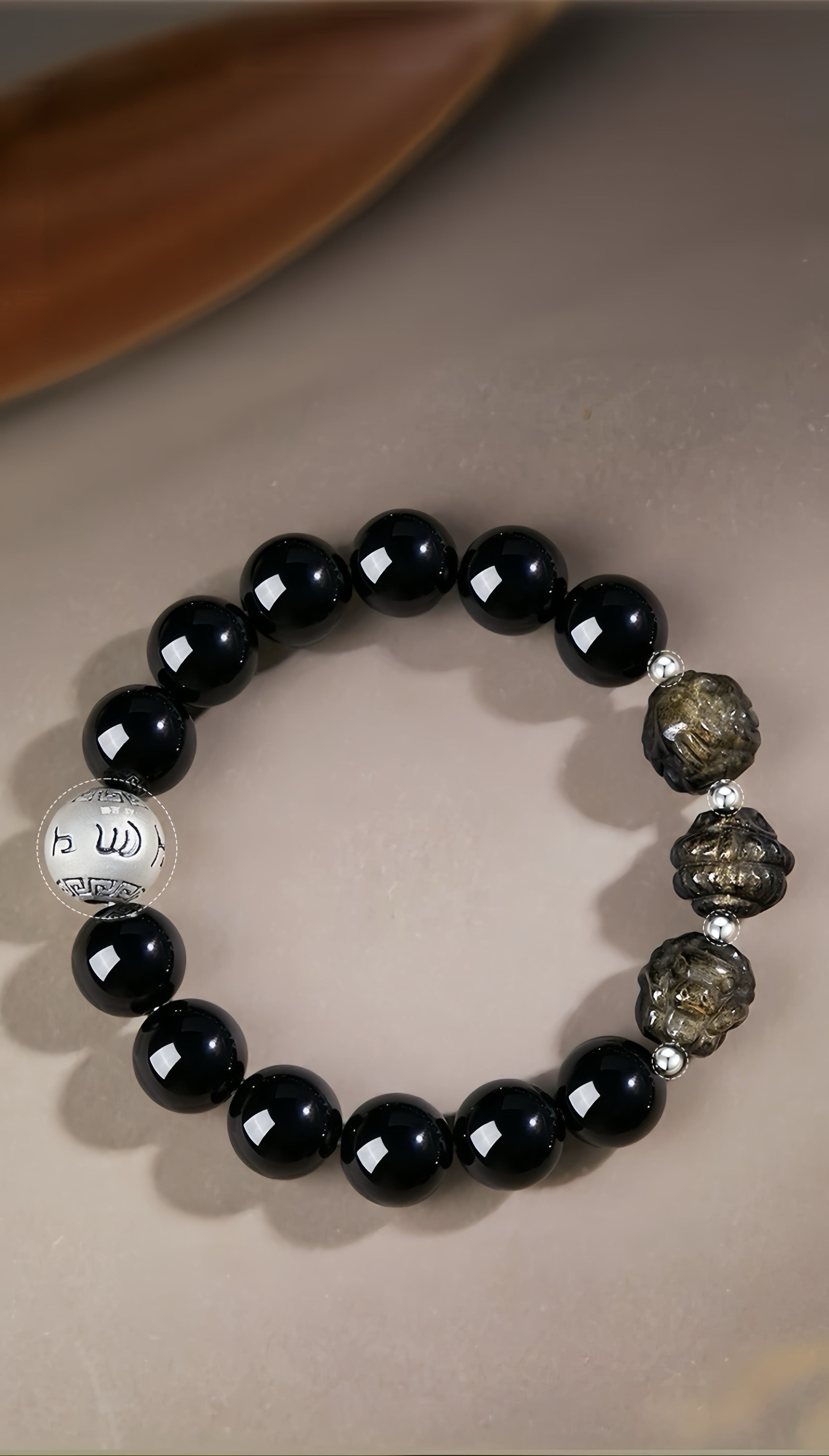 This bracelet is a personal energy system for grounding income and expanding career wealth, uniting ancient wisdom with modern purpose. It layers protective black obsidian with starlike golden sheen obsidian to attract prosperity within a shielded field.