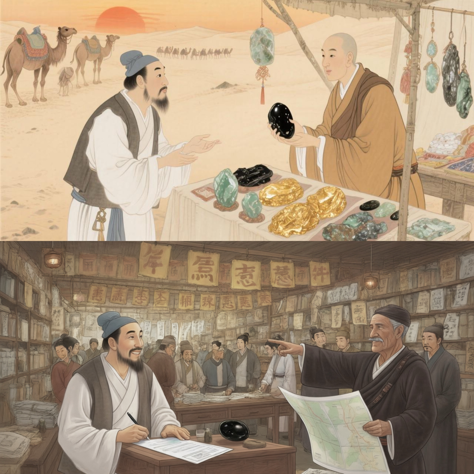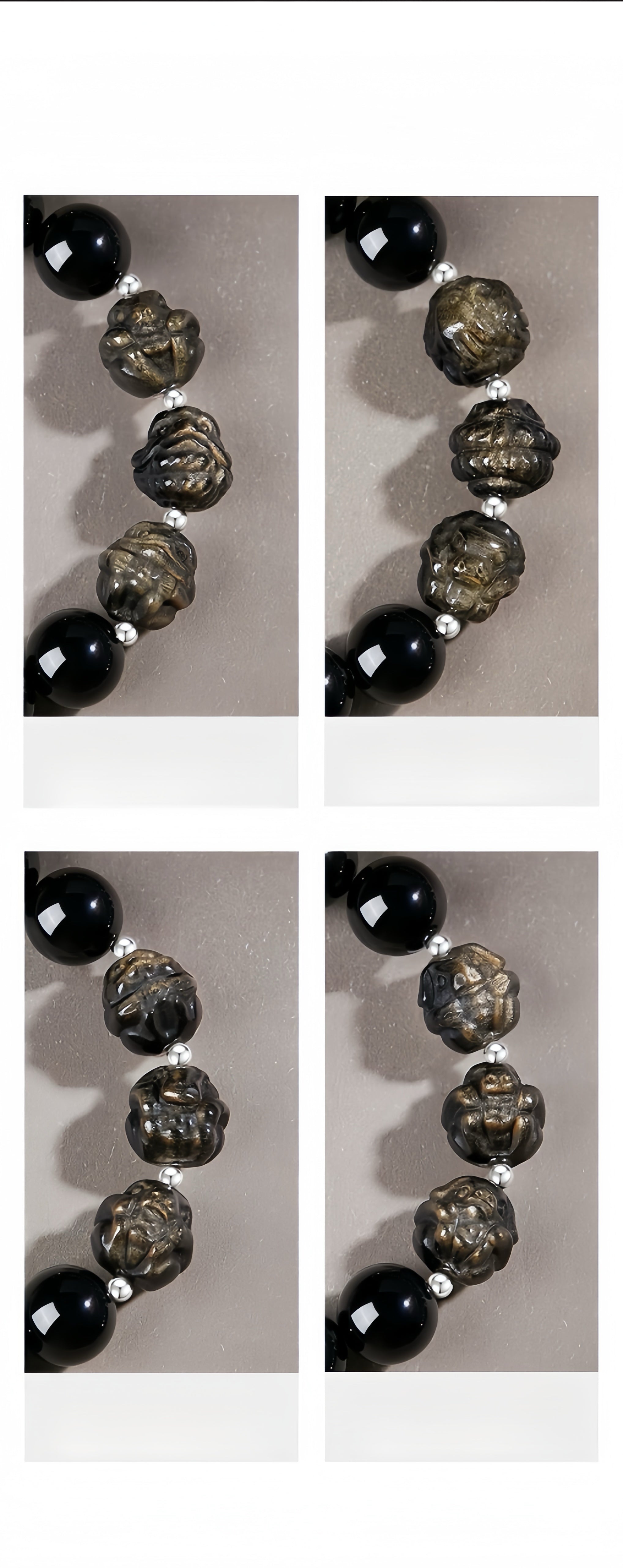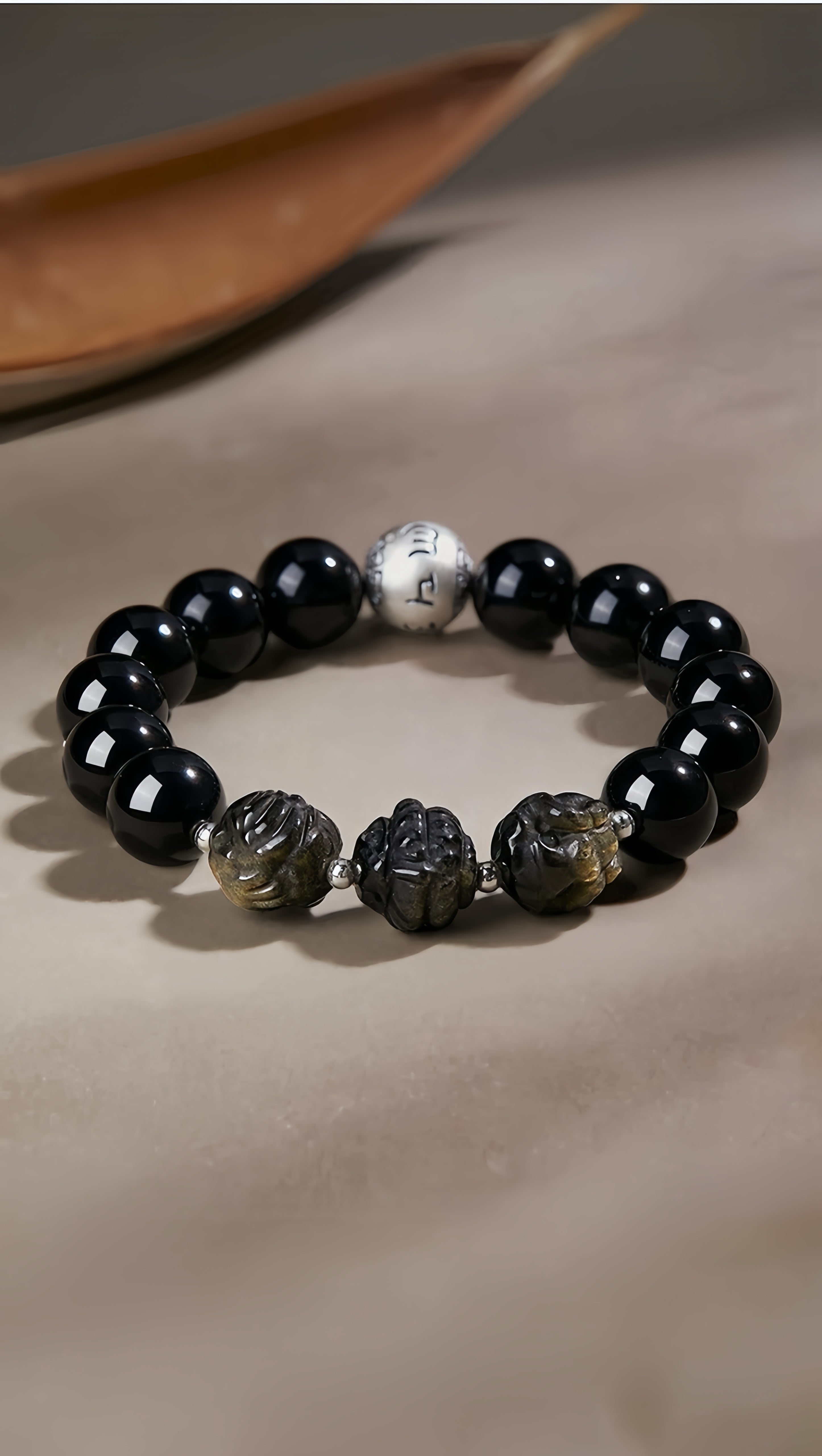 On the Silk Road, an honorable jade merchant named Lu Wen helped a traveling monk. Years later, the monk returned the kindness by crafting a unique talisman: black obsidian for grounding, golden sheen obsidian for illumination, two zodiac symbols aligned with Lu Wen's sign, and a sacred mantra for focus.